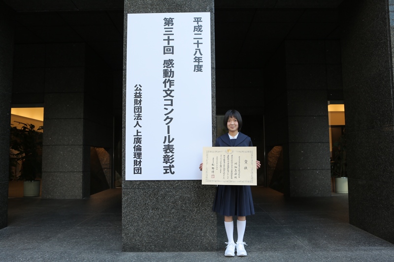 The 30th Uehiro Essay Contest Winner has been announced! Aftercareful consideration, the winner, sixth grade student, Kawabata Marin, from the Anjo Elementary School has deeply moved readers with her writing. She was officially awarded the honor in a ceremony by the Minister of Education and Science. Read her essay, “Living Life Forward Looking Up,” clicking here.